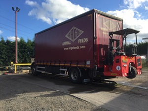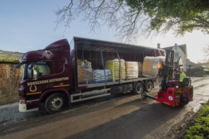 Many Farmers still prefer to use small 20-25kg bags for ease of manual handling. For economies of transport these can be delivered in multiples of pallet loads. This can create problems for delivery if the farmer does not have a forklift or front-end loader with the capacity to lift the pallet. Alternatively delivery can be complicated by having to arrange for a forklift to be on site when the lorry arrives, often resulting in one or other party having to wait for the other. Operating a Palfinger truck mounted forklift in this system offers advantages: