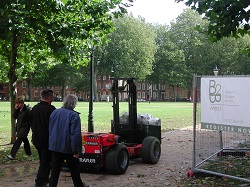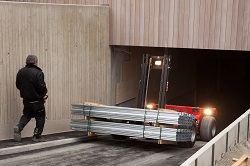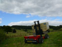 Traditional truck mounted forklifts are carried on the rear of the vehicle. The Palfinger BM is a unique concept whereby the forklift is carried in a mounting box under the vehicle.