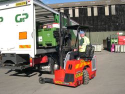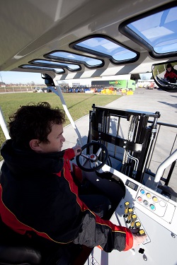 Dismounted from the vehicle and ready for work in less than 60 seconds.  Using the ground controls the driver can complete both mounting and dismounting of the forklift from ground level; an effortless and safe operation.