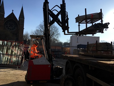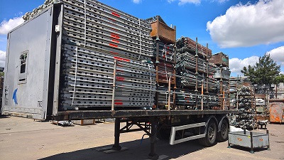 Using a Palfinger Truck Mounted Forklift, the scaffolding can be unloaded without the need for the driver to climb onto the truck. This removes the danger and site issues of working at height.